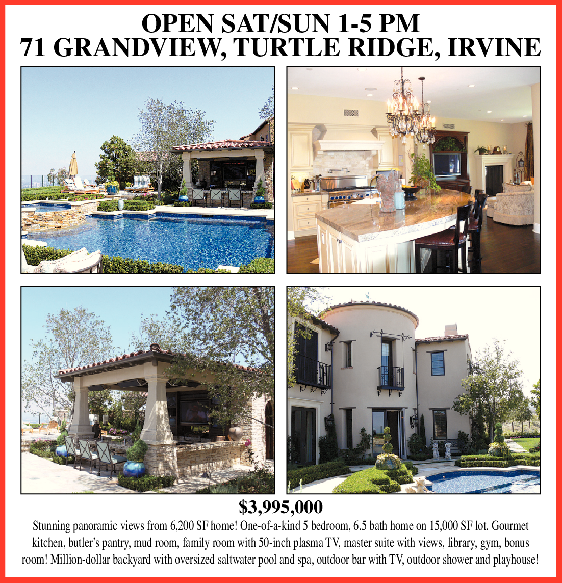 OPEN SAT/SUN 1-5 PM 71 GRANDVIEW, TURTLE RIDGE, IRVINE $3,995,000 Stunning panoramic views from 6,200 SF home! One-of-a-kind 5 bedroom, 6.5 bath home on 15,000 SF lot. Gourmet kitchen, butler’s pantry, mud room, family room with 50-inch plasma TV, master suite with views, library, gym, bonus room! Million-dollar backyard with oversized saltwater pool and spa, outdoor bar with TV, outdoor shower and playhouse!