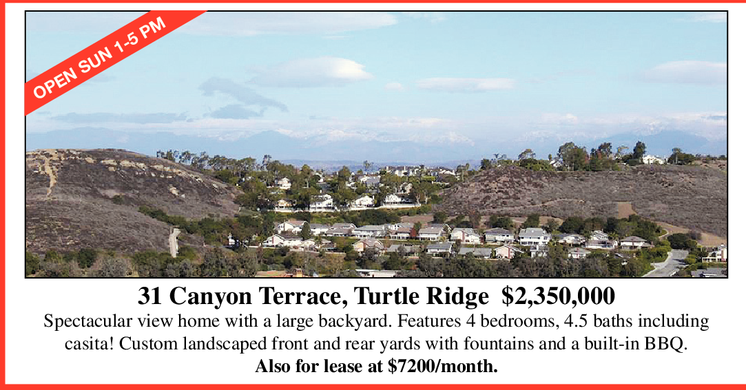 31 Canyon Terrace, Turtle Ridge $2,350,000 Spectacular view home with a large backyard. Features 4 bedrooms, 4.5 baths including casita! Custom landscaped front and rear yards with fountains and a built-in BBQ.