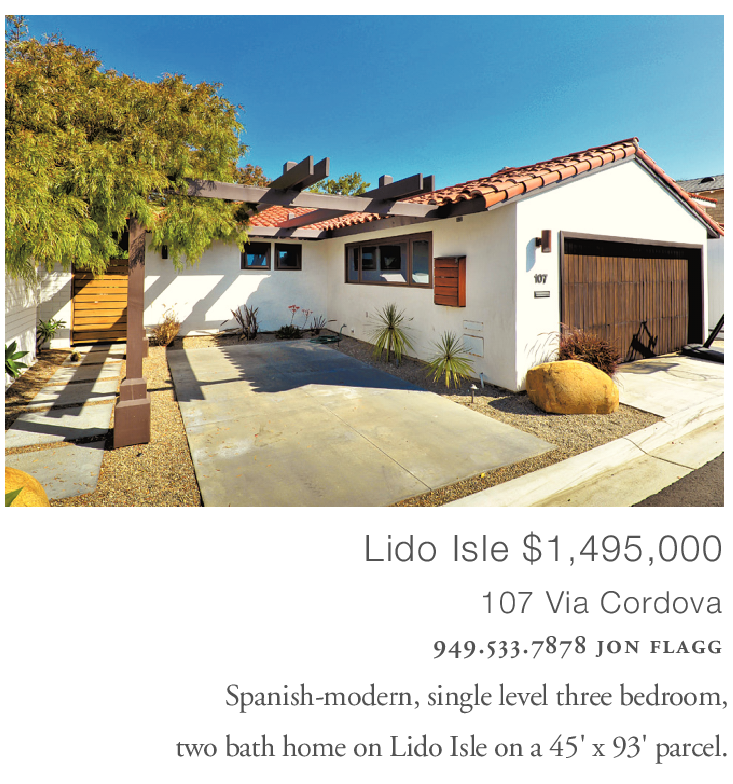 Lido Isle $1,495,000 107 Via Cordova 949.533.7878 jon flagg Spanish-modern, single level three bedroom, two bath home on Lido Isle on a 45' x 93' parcel.