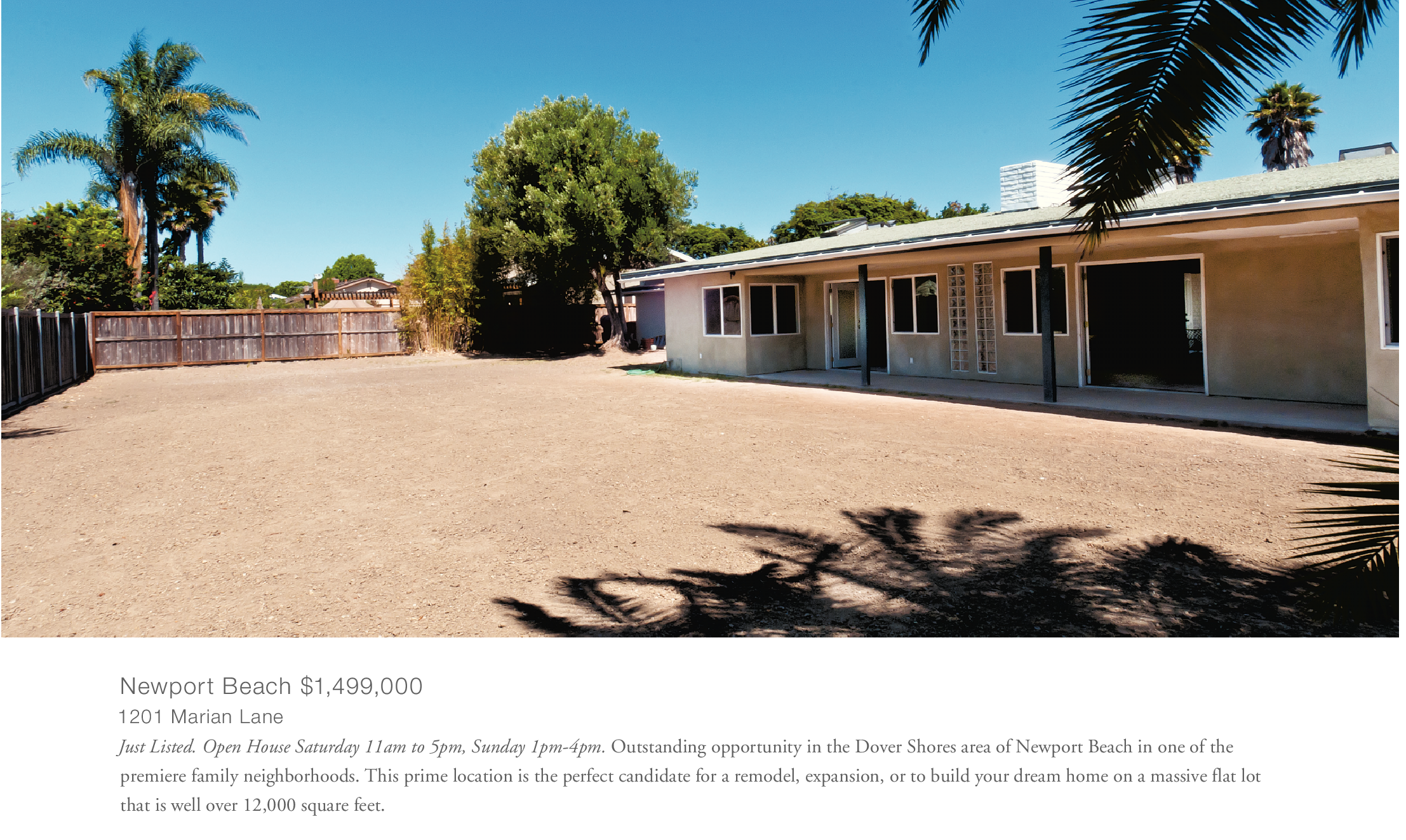 Newport Beach $1,499,000 1201 Marian Lane Just Listed. Open House Saturday 11am to 5pm, Sunday 1pm-4pm. Outstanding opportunity in the Dover Shores area of Newport Beach in one of the premiere family neighborhoods. This prime location is the perfect candidate for a remodel, expansion, or to build your dream home on a massive flat lot that is well over 12,000 square feet.
