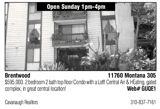 Brentwood 11760 Montana 305 $595,000. 2 bedroom 2 bath top floor Condo with a Loft! Central Air & HEating, gated complex, in great central location! Web# GUQE1 Cavanaugh Realtors 310-837-7161