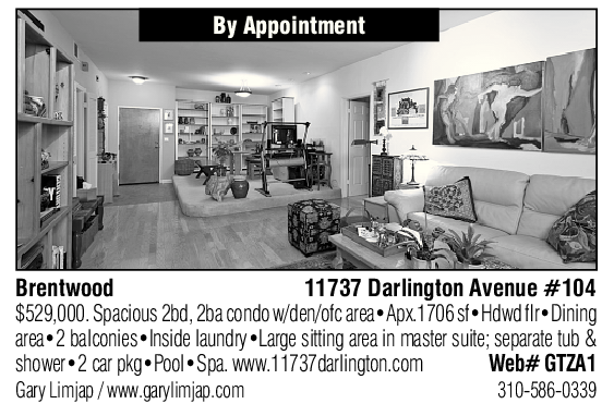 Brentwood 11737 Darlington Avenue #104 $529,000. Spacious 2bd, 2ba condo w/den/ofc area•Apx.1706 sf•Hdwd flr•Dining area•2 balconies•Inside laundry•Large sitting area in master suite; separate tub & shower•2 car pkg•Pool•Spa. www.11737darlington.com Web# GTZA1 Gary Limjap / www.garylimjap.com 310-586-0339