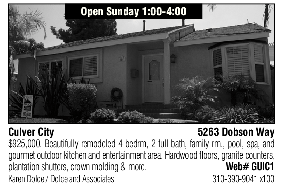 Culver City 5263 Dobson Way $925,000. Beautifully remodeled 4 bedrm, 2 full bath, family rm., pool, spa, and gourmet outdoor kitchen and entertainment area. Hardwood floors, granite counters, plantation shutters, crown molding & more. Web# GUIC1 Karen Dolce / Dolce and Associates 310-390-9041 x100
