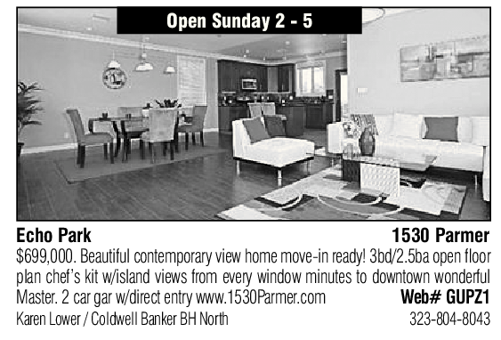 Echo Park 1530 Parmer $699,000. Beautiful contemporary view home move-in ready! 3bd/2.5ba open floor plan chef’s kit w/island views from every window minutes to downtown wonderful Master. 2 car gar w/direct entry www.1530Parmer.com Web# GUPZ1 Karen Lower / Coldwell Banker BH North 323-804-8043
