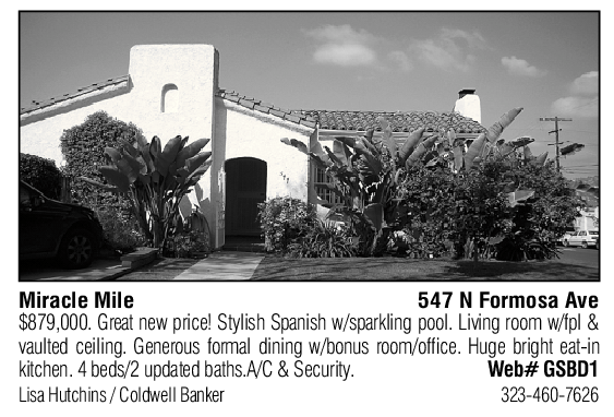 Miracle Mile 547 N Formosa Ave $879,000. Great new price! Stylish Spanish w/sparkling pool. Living room w/fpl & vaulted ceiling. Generous formal dining w/bonus room/office. Huge bright eat-in kitchen. 4 beds/2 updated baths.A/C & Security. Web# GSBD1 Lisa Hutchins / Coldwell Banker 323-460-7626
