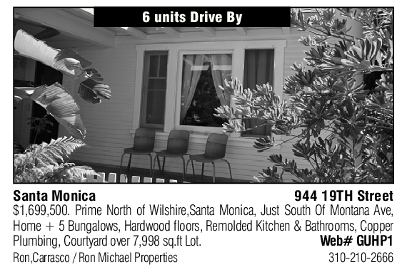 Santa Monica 944 19TH Street $1,699,500. Prime North of Wilshire,Santa Monica, Just South Of Montana Ave, Home + 5 Bungalows, Hardwood floors, Remolded Kitchen & Bathrooms, Copper Plumbing, Courtyard over 7,998 sq.ft Lot. Web# GUHP1 Ron,Carrasco / Ron Michael Properties 310-210-2666