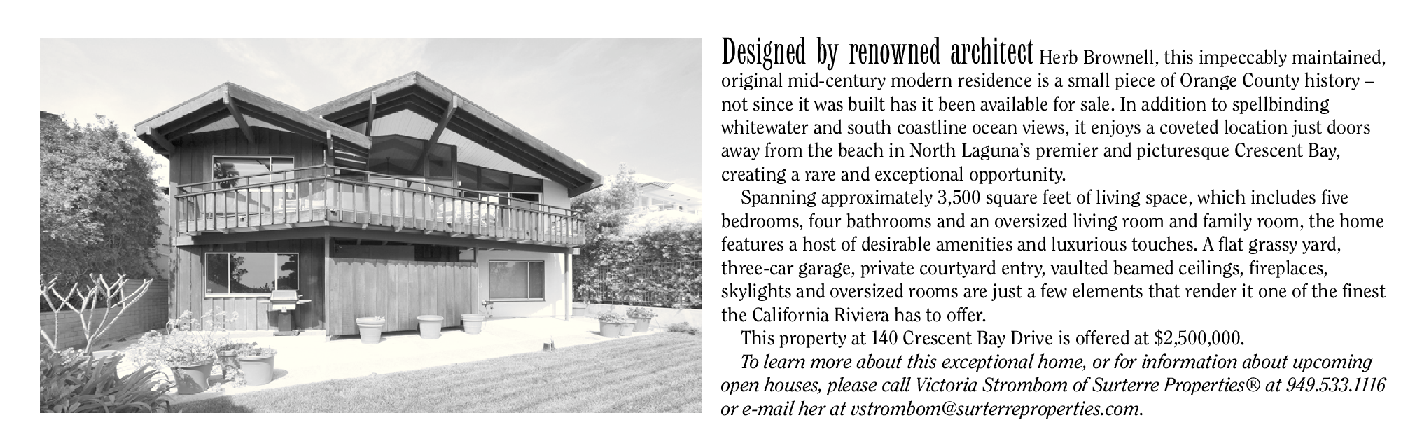 This property at 140 Crescent Bay Drive is offered at $2,500,000. To learn more about this exceptional home, or for information about upcoming open houses, please call Victoria Strombom of Surterre Properties® at 949.533.1116 or e-mail her at vstrombom@surterreproperties.com.