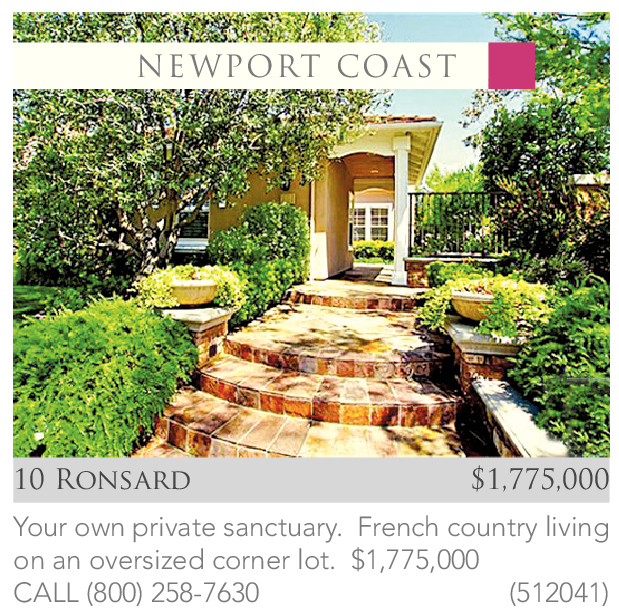 10 Ronsard $1,775,000 Your own private sanctuary. French country living on an oversized corner lot. $1,775,000 CALL (800) 258-7630 (512041)