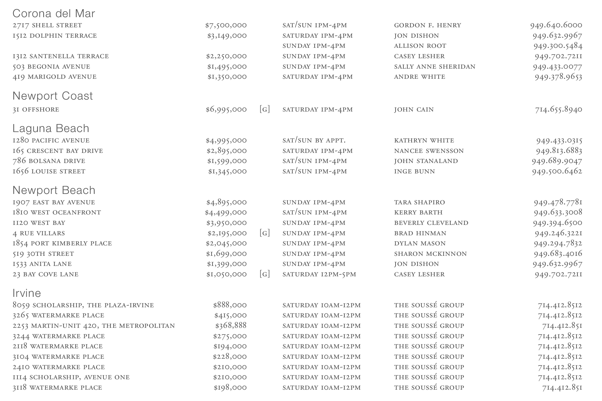 Corona del Mar 2717 shell street $7,500,000 sat/sun 1pm-4pm gordon f. henry 949.640.6000 1512 dolphin terrace $3,149,000 saturday 1pm-4pm jon dishon 949.632.9967 sunday 1pm-4pm allison root 949.300.5484 1312 santenella terrace $2,250,000 sunday 1pm-4pm casey lesher 949.702.7211 503 begonia avenue $1,495,000 sunday 1pm-4pm sally anne sheridan 949.433.0077 419 marigold avenue $1,350,000 saturday 1pm-4pm andre white 949.378.9653