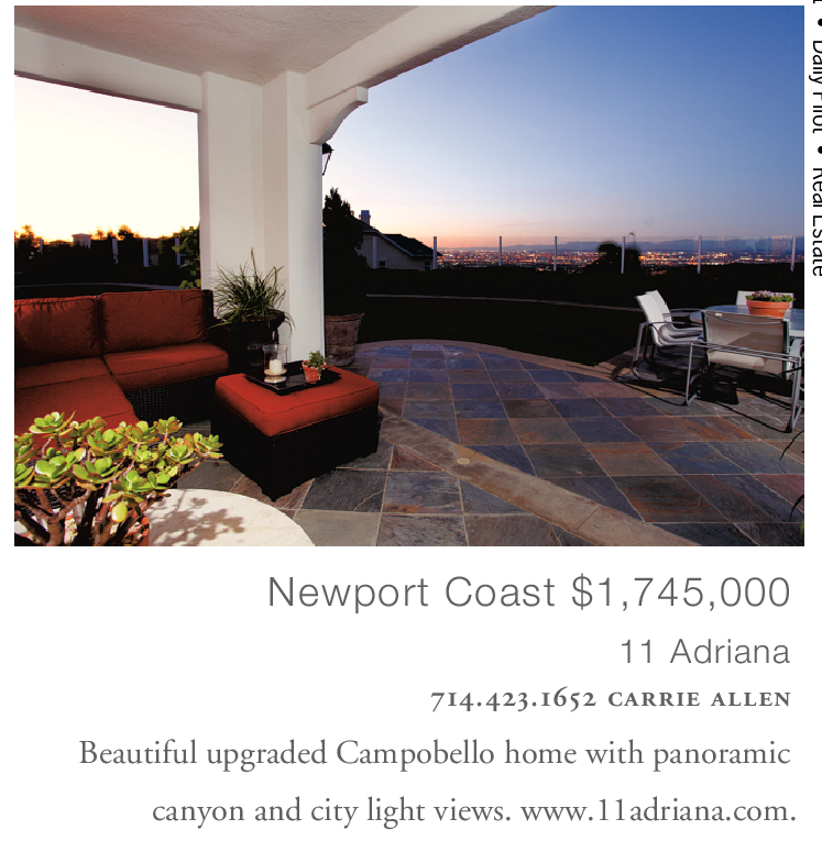 Newport Coast $1,745,000 11 Adriana 714.423.1652 carrie allen Beautiful upgraded Campobello home with panoramic canyon and city light views. www.11adriana.com.