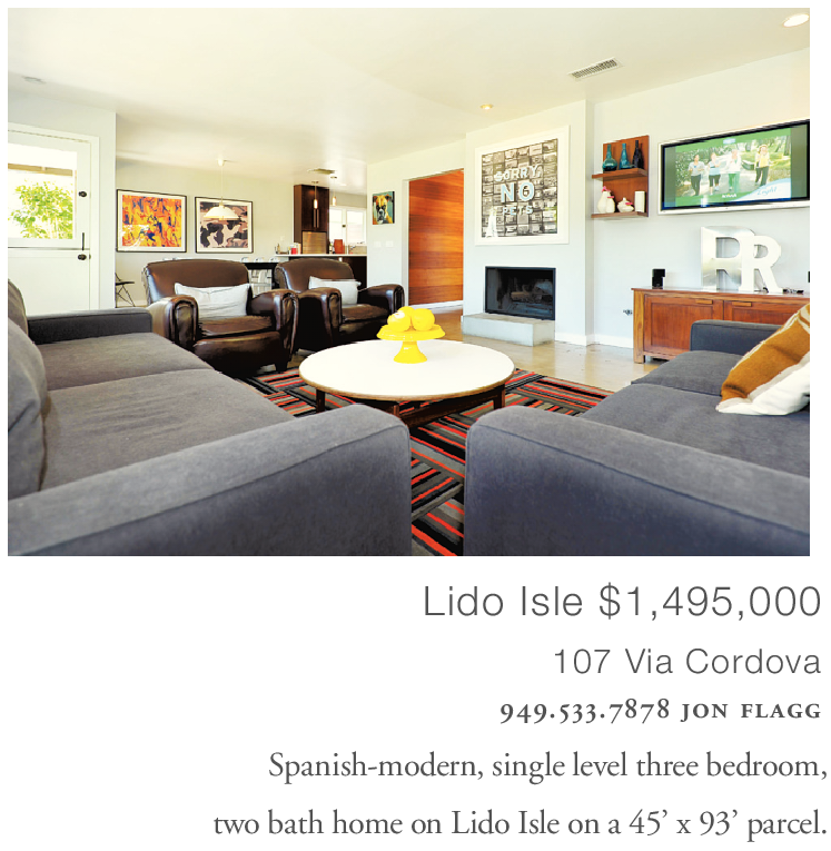 Lido Isle $1,495,000 107 Via Cordova 949.533.7878 jon flagg Spanish-modern, single level three bedroom, two bath home on Lido Isle on a 45’ x 93’ parcel.