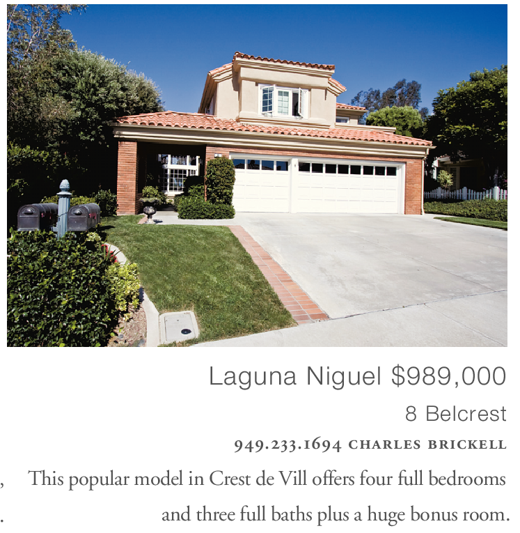 Laguna Niguel $989,000 8 Belcrest 949.233.1694 charles brickell This popular model in Crest de Vill offers four full bedrooms and three full baths plus a huge bonus room.