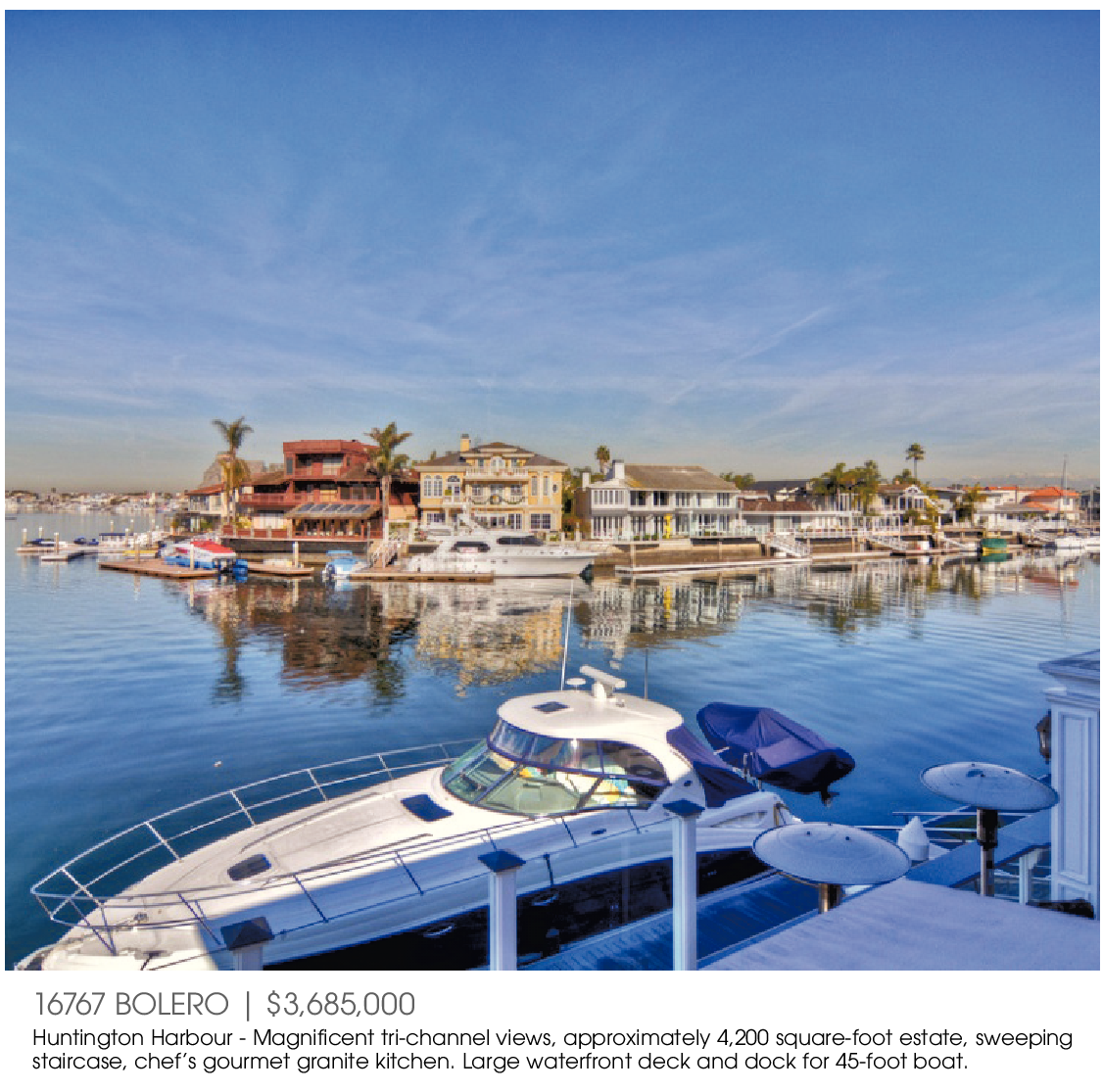 16767 BOLERO | $3,685,000 Huntington Harbour - Magnificent tri-channel views, approximately 4,200 square-foot estate, sweeping staircase, chef’s gourmet granite kitchen. Large waterfront deck and dock for 45-foot boat.