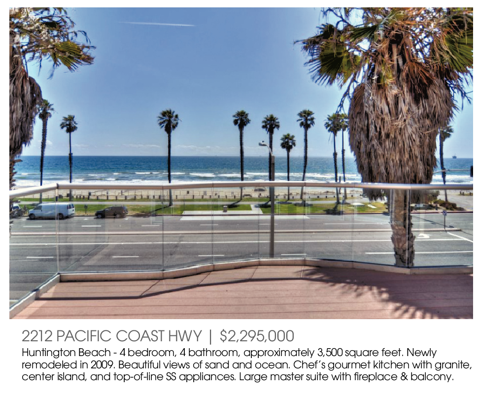 2212 PACIFIC COAST HWY | $2,295,000 Huntington Beach - 4 bedroom, 4 bathroom, approximately 3,500 square feet. Newly remodeled in 2009. Beautiful views of sand and ocean. Chef’s gourmet kitchen with granite, center island, and top-of-line SS appliances. Large master suite with fireplace & balcony.