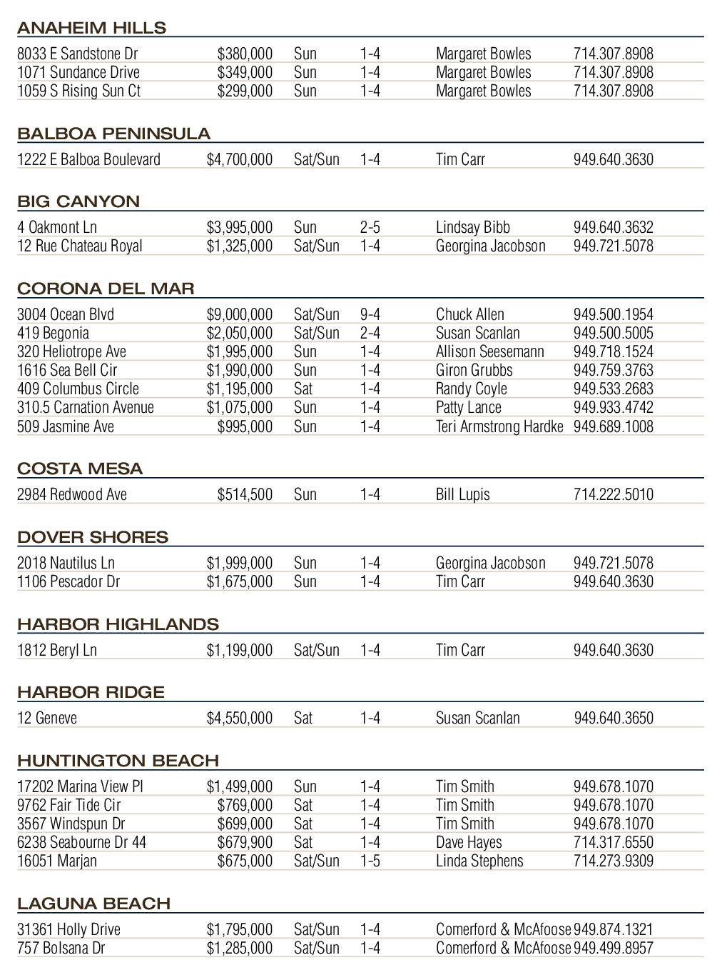 CORONA DEL MAR 3004 Ocean Blvd $9,000,000 Sat/Sun 9-4 Chuck Allen 949.500.1954 419 Begonia $2,050,000 Sat/Sun 2-4 Susan Scanlan 949.500.5005 320 Heliotrope Ave $1,995,000 Sun 1-4 Allison Seesemann 949.718.1524 1616 Sea Bell Cir $1,990,000 Sun 1-4 Giron Grubbs 949.759.3763 409 Columbus Circle $1,195,000 Sat 1-4 Randy Coyle 949.533.2683 310.5 Carnation Avenue $1,075,000 Sun 1-4 Patty Lance 949.933.4742 509 Jasmine Ave $995,000 Sun 1-4 Teri Armstrong Hardke 949.689.1008