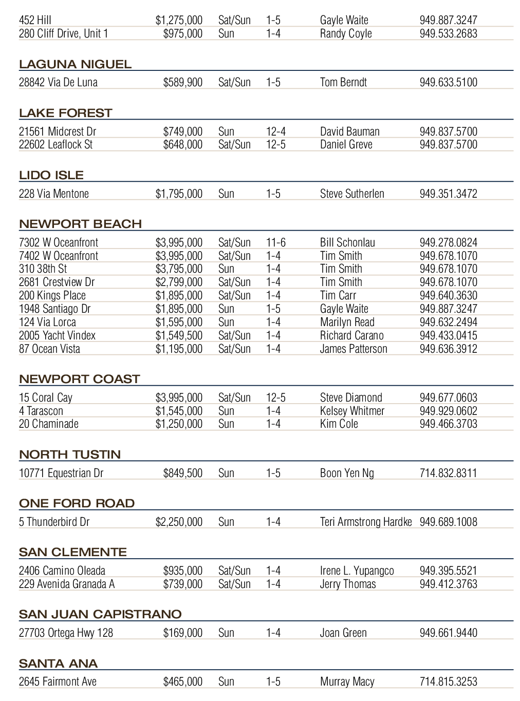 NEWPORT BEACH 7302 W Oceanfront $3,995,000 Sat/Sun 11-6 Bill Schonlau 949.278.0824 7402 W Oceanfront $3,995,000 Sat/Sun 1-4 Tim Smith 949.678.1070 310 38th St $3,795,000 Sun 1-4 Tim Smith 949.678.1070 2681 Crestview Dr $2,799,000 Sat/Sun 1-4 Tim Smith 949.678.1070 200 Kings Place $1,895,000 Sat/Sun 1-4 Tim Carr 949.640.3630 1948 Santiago Dr $1,895,000 Sun 1-5 Gayle Waite 949.887.3247 124 Via Lorca $1,595,000 Sun 1-4 Marilyn Read 949.632.2494 2005 Yacht Vindex $1,549,500 Sat/Sun 1-4 Richard Carano 949.433.0415 87 Ocean Vista $1,195,000 Sat/Sun 1-4 James Patterson 949.636.3912