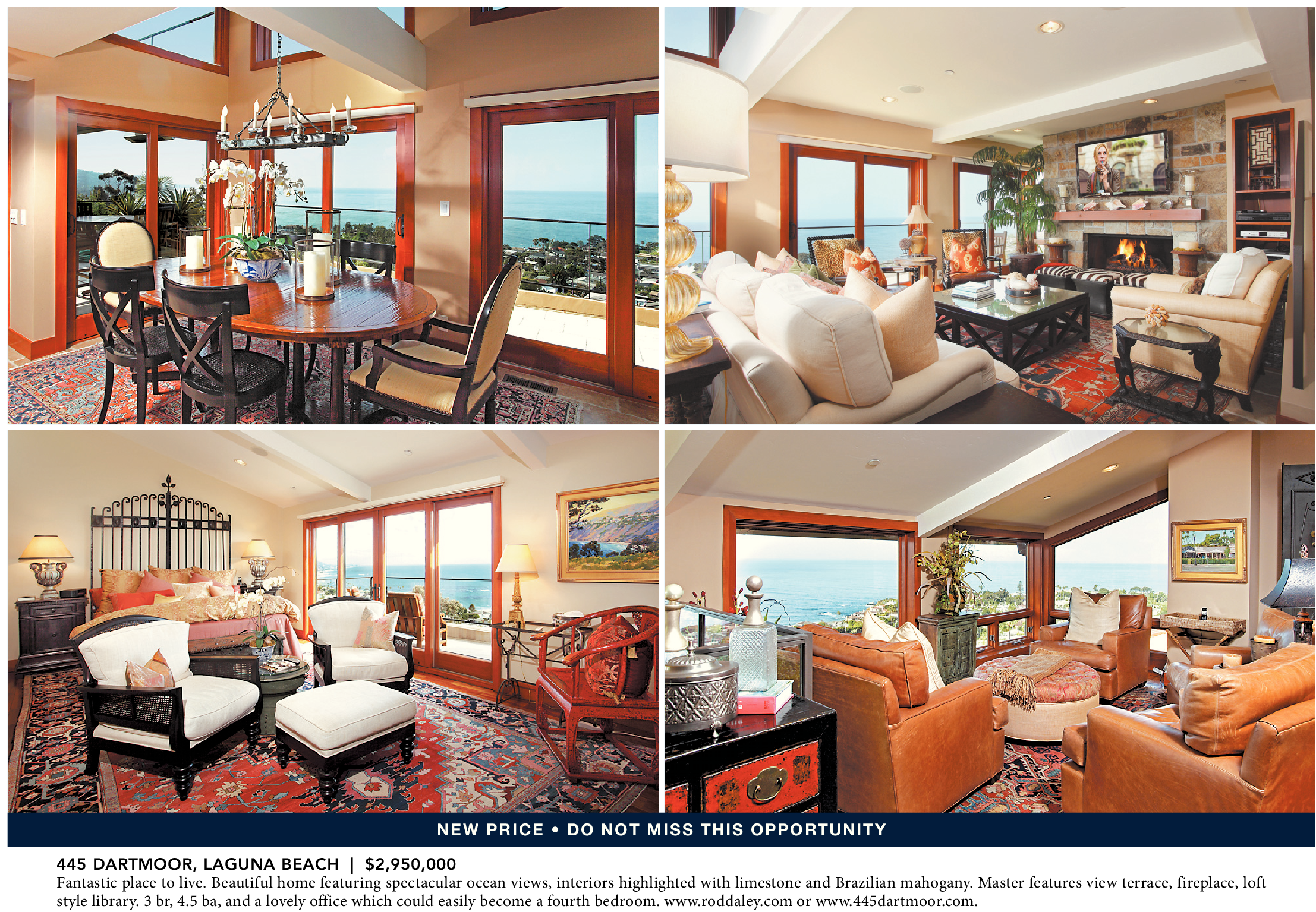 NEW PRICE • DO NOT MISS THIS OPPORTUNITY 445 DARTMOOR, LAGUNA BEACH | $2,950,000 Fantastic place to live. Beautiful home featuring spectacular ocean views, interiors highlighted with limestone and Brazilian mahogany. Master features view terrace, fireplace, loft style library. 3 br, 4.5 ba, and a lovely office which could easily become a fourth bedroom. www.roddaley.com or www.445dartmoor.com.