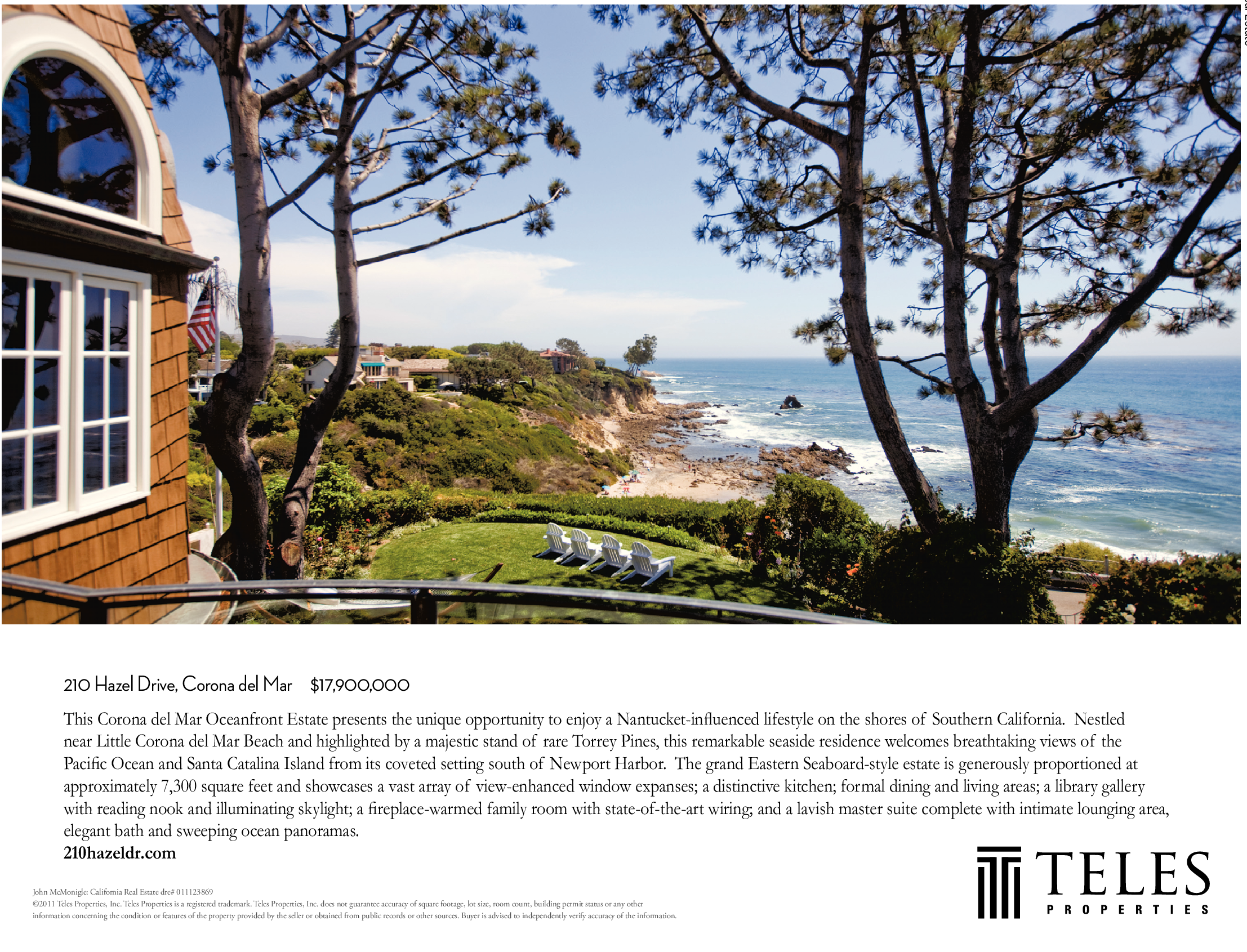 210 Hazel Drive, Corona del Mar $17,900,000 This Corona del Mar Oceanfront Estate presents the unique opportunity to enjoy a Nantucket-influenced lifestyle on the shores of Southern California. Nestled near Little Corona del Mar Beach and highlighted by a majestic stand of rare Torrey Pines, this remarkable seaside residence welcomes breathtaking views of the Pacific Ocean and Santa Catalina Island from its coveted setting south of Newport Harbor. The grand Eastern Seaboard-style estate is generously proportioned at approximately 7,300 square feet and showcases a vast array of view-enhanced window expanses; a distinctive kitchen; formal dining and living areas; a library gallery with reading nook and illuminating skylight; a fireplace-warmed family room with state-of-the-art wiring; and a lavish master suite complete with intimate lounging area, elegant bath and sweeping ocean panoramas. 210hazeldr.com John McMonigle: California Real Estate dre# 011123869 ©2011 Teles Properties, Inc. Teles Properties is a registered trademark. Teles Properties, Inc. does not guarantee accuracy of square footage, lot size, room count, building permit status or any other information concerning the condition or features of the property provided by the seller or obtained from public records or other sources. Buyer is advised to independently verify accuracy of the information.