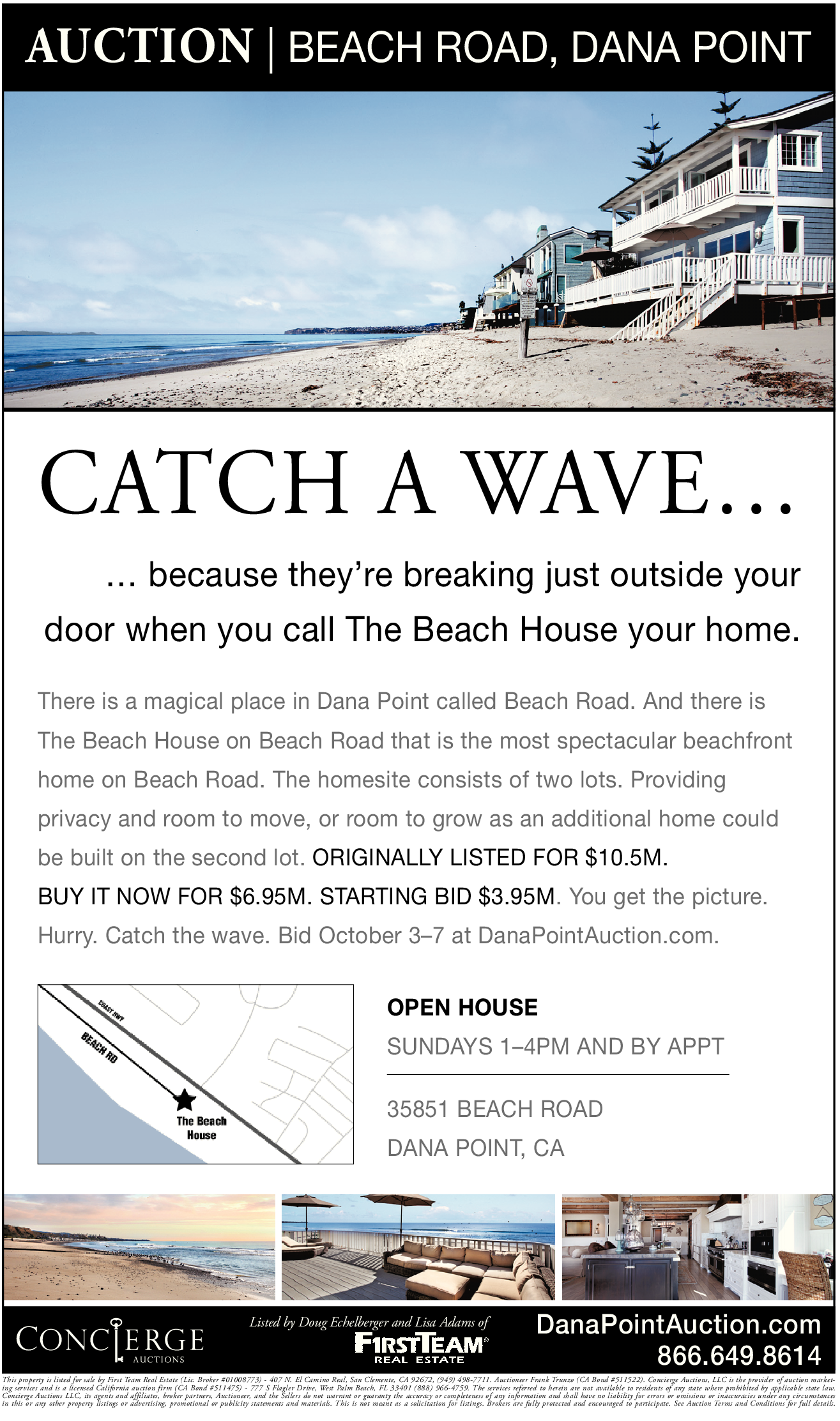 AUCTION | BeACH ROAD, DAnA POinT CATCH A WAVE… … because they’re breaking just outside your door when you call The Beach House your home. There is a magical place in Dana Point called Beach Road. And there is The Beach House on Beach Road that is the most spectacular beachfront home on Beach Road. The homesite consists of two lots. Providing privacy and room to move, or room to grow as an additional home could be built on the second lot. ORiginAlly lisTeD fOR $10.5M. Buy iT nOw fOR $6.95M. sTARTing BiD $3.95M. you get the picture. Hurry. Catch the wave. Bid October 3–7 at DanaPointAuction.com. Open HOuse sunDAys 1–4PM AnD By APPT 35851 BeACH ROAD DAnA POinT, CA Listed by Doug Echelberger and Lisa Adams of DanaPointAuction.com 866.649.8614 This property is listed for sale by First Team Real Estate (Lic. Broker #01008773) - 407 N. El Camino Real, San Clemente, CA 92672, (949) 498-7711. Auctioneer Frank Trunzo (CA Bond #511522). Concierge Auctions, LLC is the provider of auction marketing services and is a licensed California auction firm (CA Bond #511475) - 777 S Flagler Drive, West Palm Beach, FL 33401 (888) 966-4759. The services referred to herein are not available to residents of any state where prohibited by applicable state law. Concierge Auctions LLC, its agents and affiliates, broker partners, Auctioneer, and the Sellers do not warrant or guaranty the accuracy or completeness of any information and shall have no liability for errors or omissions or inaccuracies under any circumstances in this or any other property listings or advertising, promotional or publicity statements and materials. This is not meant as a solicitation for listings. Brokers are fully protected and encouraged to participate. See Auction Terms and Conditions for full details.