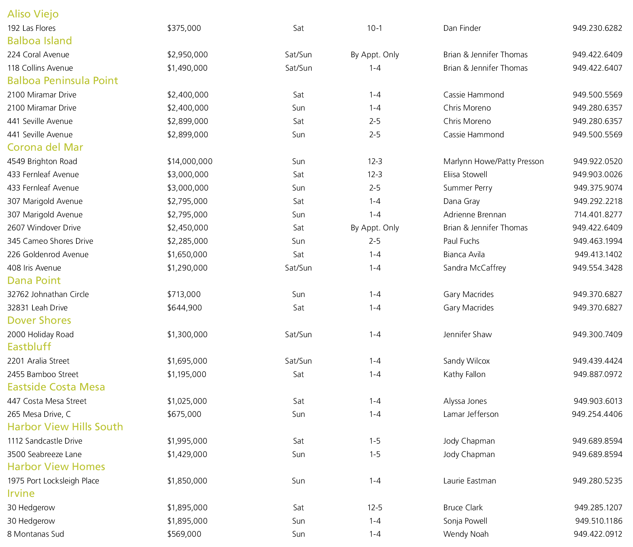 4549 Brighton Road $14,000,000 Sun 12-3 Marlynn Howe/Patty Presson 949.922.0520 433 Fernleaf Avenue $3,000,000 Sat 12-3 Eliisa Stowell 949.903.0026 433 Fernleaf Avenue $3,000,000 Sun 2-5 Summer Perry 949.375.9074 307 Marigold Avenue $2,795,000 Sat 1-4 Dana Gray 949.292.2218 307 Marigold Avenue $2,795,000 Sun 1-4 Adrienne Brennan 714.401.8277 2607 Windover Drive $2,450,000 Sat By Appt. Only Brian & Jennifer Thomas 949.422.6409 345 Cameo Shores Drive $2,285,000 Sun 2-5 Paul Fuchs 949.463.1994 226 Goldenrod Avenue $1,650,000 Sat 1-4 Bianca Avila 949.413.1402