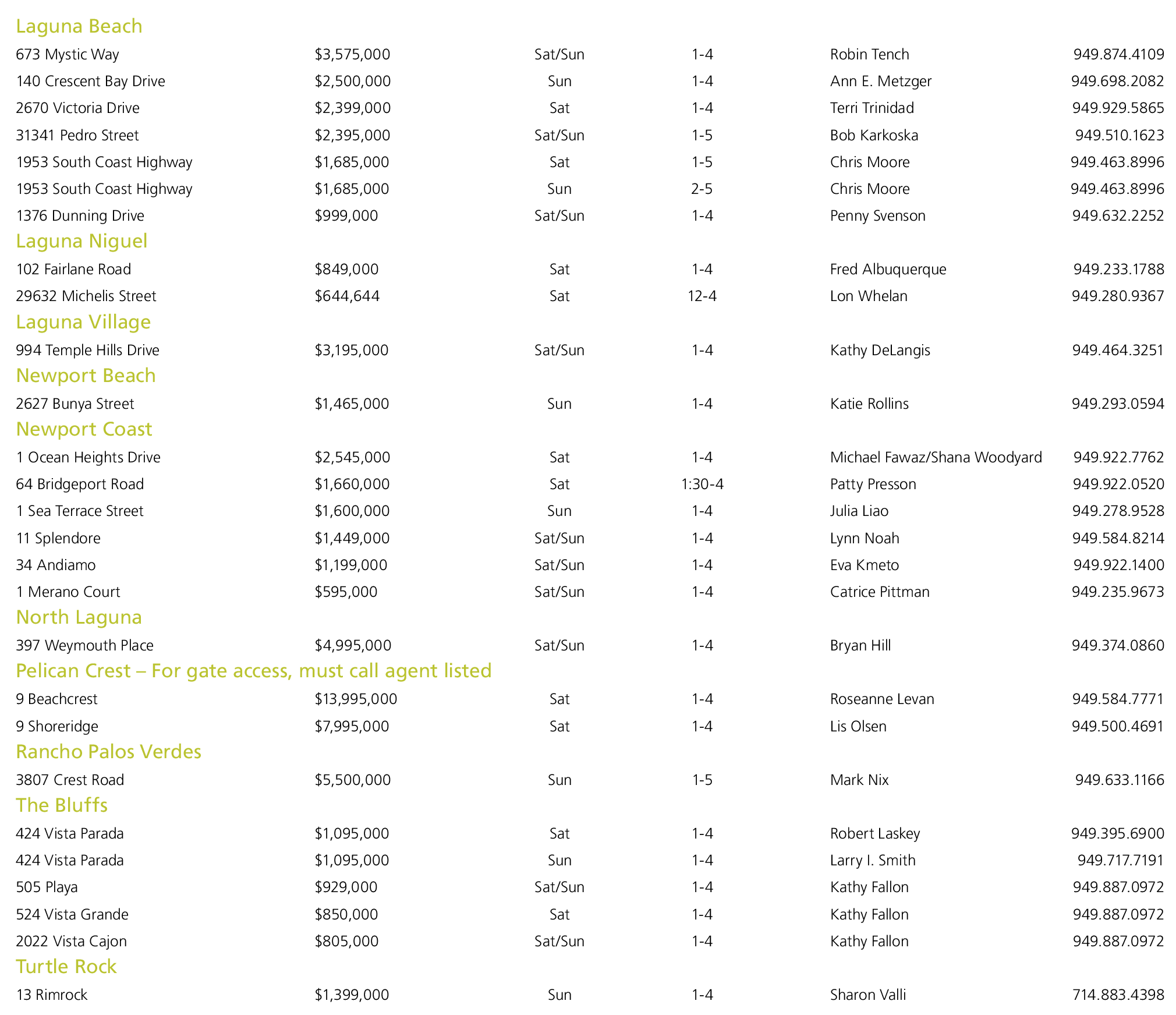 1 Merano Court $595,000 Sat/Sun 1-4 Catrice Pittman 949.235.9673 North Laguna 397 Weymouth Place $4,995,000 Sat/Sun 1-4 Bryan Hill 949.374.0860 Pelican Crest – For gate access, must call agent listed