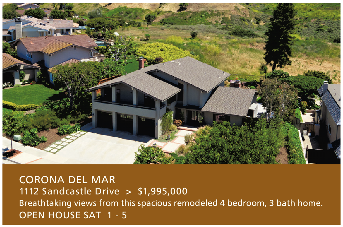 CORONA DEL MAR 1112 Sandcastle Drive > $1,995,000 Breathtaking views from this spacious remodeled 4 bedroom, 3 bath home. OPEN HOUSE SAT 1 - 5
