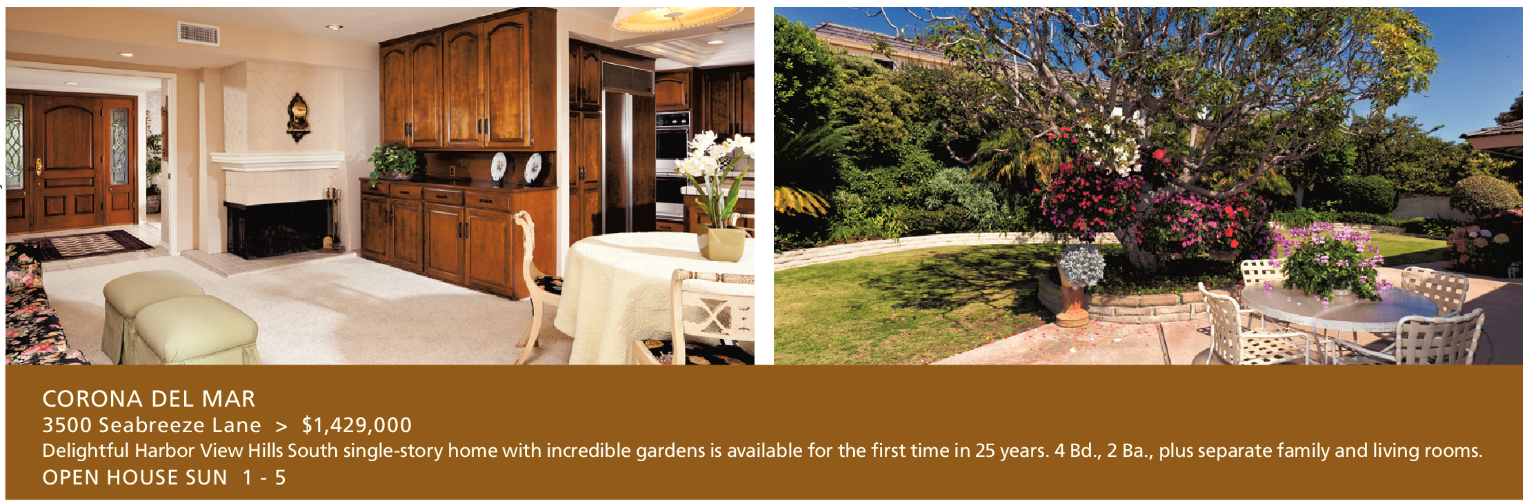 CORONA DEL MAR 3500 Seabreeze Lane > $1,429,000 Delightful Harbor View Hills South single-story home with incredible gardens is available for the first time in 25 years. 4 Bd., 2 Ba., plus separate family and living rooms. OPEN HOUSE SUN 1 - 5