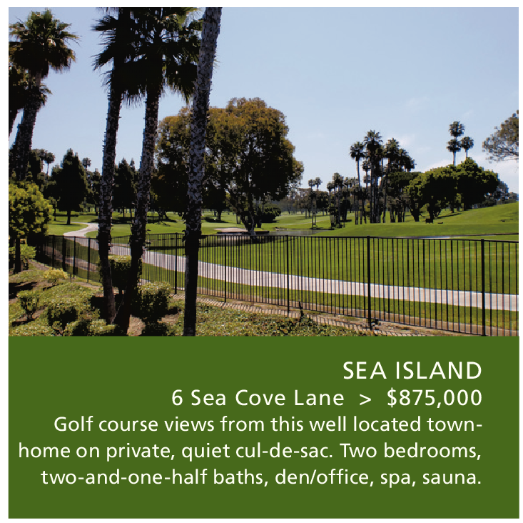 SEA ISLAND 6 Sea Cove Lane > $875,000 Golf course views from this well located townhome on private, quiet cul-de-sac. Two bedrooms, two-and-one-half baths, den/office, spa, sauna.
