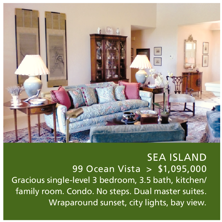 SEA ISLAND 99 Ocean Vista > $1,095,000 Gracious single-level 3 bedroom, 3.5 bath, kitchen/ family room. Condo. No steps. Dual master suites.