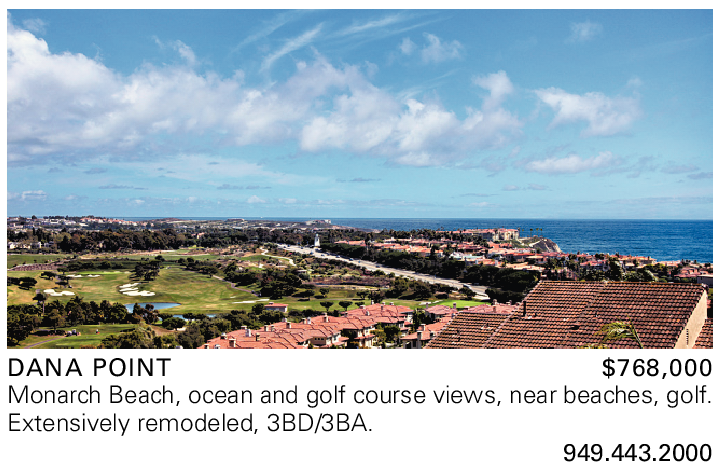 DANA POINT $768,000 Monarch Beach, ocean and golf course views, near beaches, golf. Extensively remodeled, 3BD/3BA.