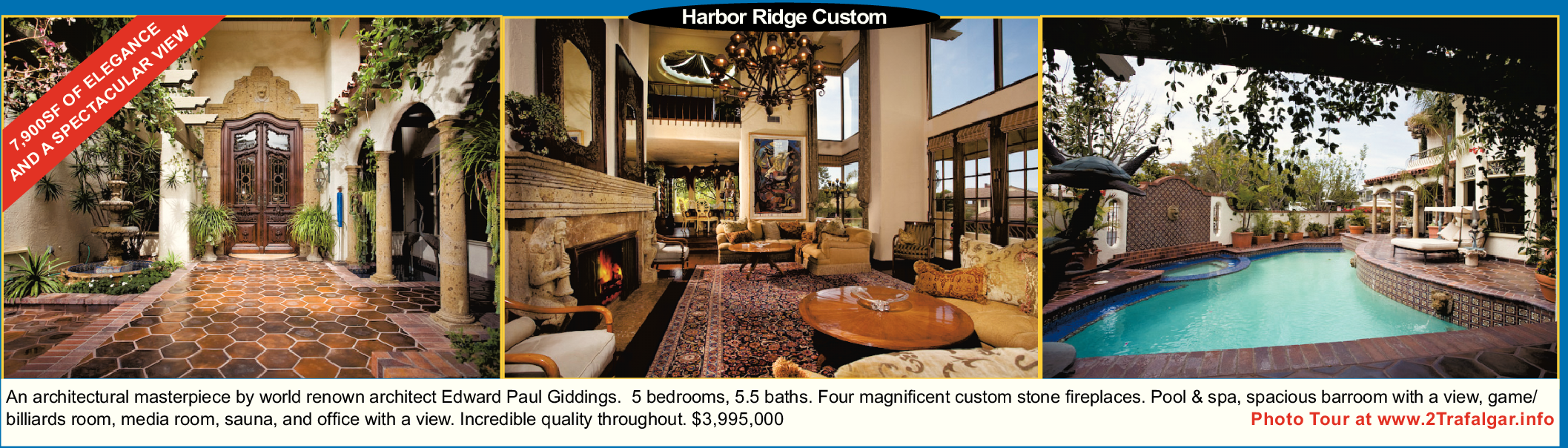 An architectural masterpiece by world renown architect Edward Paul Giddings. 5 bedrooms, 5.5 baths. Four magnificent custom stone fireplaces. Pool & spa, spacious barroom with a view, game/ billiards room, media room, sauna, and office with a view. Incredible quality throughout. $3,995,000 Photo Tour at www.2Trafalgar.info