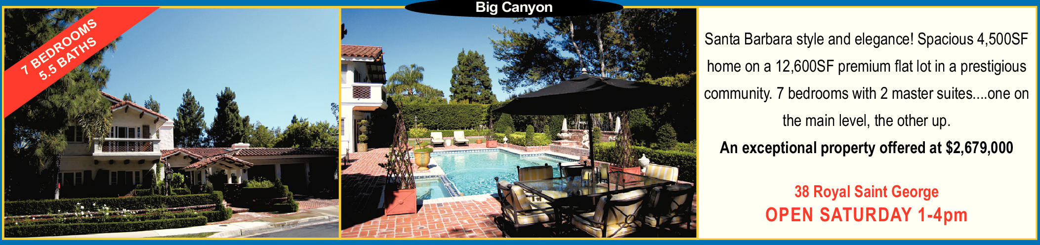 Santa Barbara style and elegance! Spacious 4,500SF home on a 12,600SF premium flat lot in a prestigious community. 7 bedrooms with 2 master suites....one on the main level, the other up.