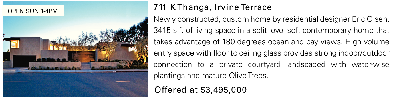 711 K Thanga, Irvine Terrace Newly constructed, custom home by residential designer Eric Olsen. 3415 s.f. of living space in a split level soft contemporary home that takes advantage of 180 degrees ocean and bay views. High volume entry space with floor to ceiling glass provides strong indoor/outdoor connection to a private courtyard landscaped with water-wise plantings and mature Olive Trees.