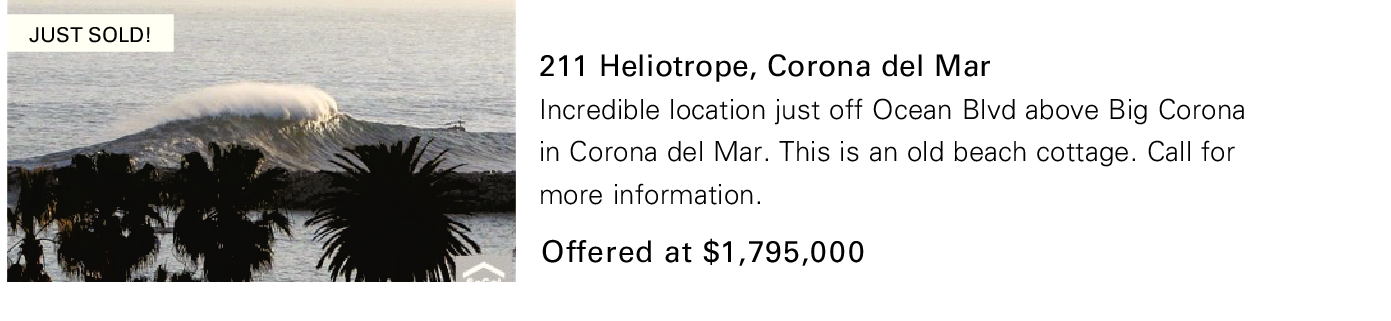 Incredible location just off Ocean Blvd above Big Corona in Corona del Mar. This is an old beach cottage. Call for more information.