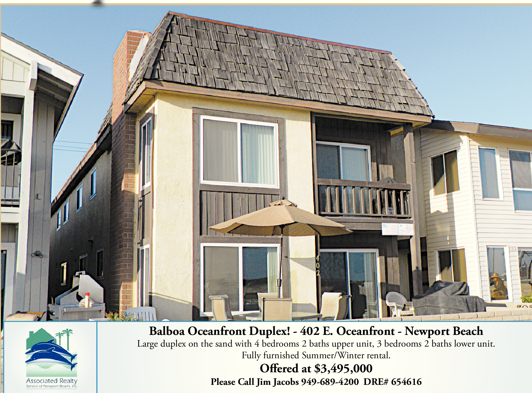 Balboa Oceanfront Duplex! - 402 E. Oceanfront - Newport Beach Large duplex on the sand with 4 bedrooms 2 baths upper unit, 3 bedrooms 2 baths lower unit. Fully furnished Summer/Winter rental. Offered at $3,495,000 Please Call Jim Jacobs 949-689-4200 DRE# 654616