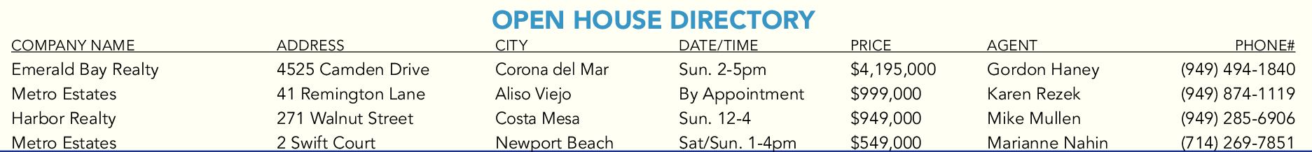OPEN HOUSE DIRECTORY COMPANY NAME ADDRESS CITY DATE/TIME PRICE AGENT PHONE# Emerald Bay Realty 4525 Camden Drive Corona del Mar Sun. 2-5pm $4,195,000 Gordon Haney (949) 494-1840 Metro Estates 41 Remington Lane Aliso Viejo By Appointment $999,000 Karen Rezek (949) 874-1119 Harbor Realty 271 Walnut Street Costa Mesa Sun. 12-4 $949,000 Mike Mullen (949) 285-6906 Metro Estates 2 Swift Court Newport Beach Sat/Sun. 1-4pm $549,000 Marianne Nahin (714) 269-7851
