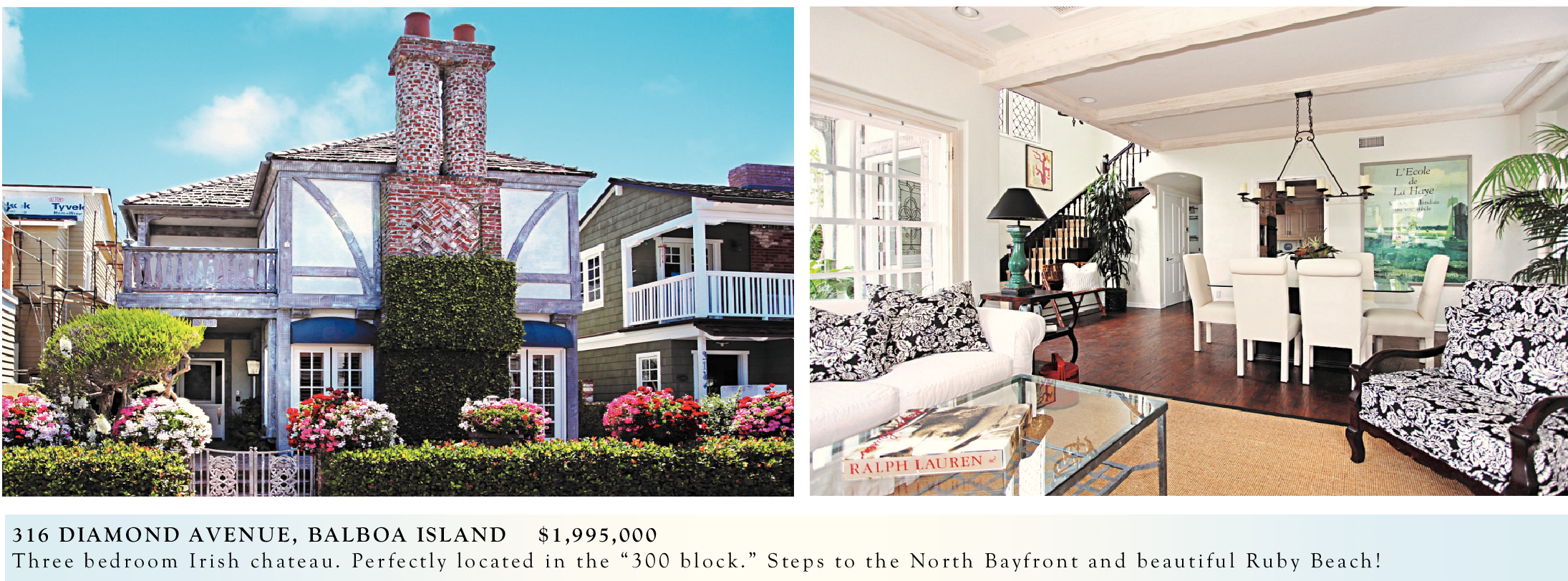 316 DIAMOND AVENUE, BALBOA ISLAND $1,995,000 Three bedroom Irish chateau. Perfectly located in the “300 block.” Steps to the North Bayfront and beautiful Ruby Beach!