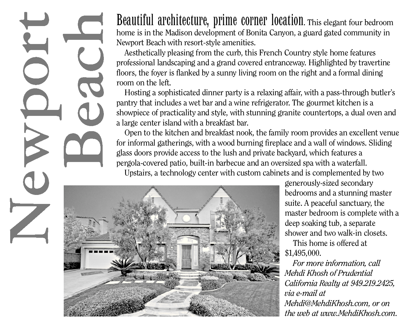 For more information, call Mehdi Khosh of Prudential California Realty at 949.219.2425, via e-mail at Mehdi@MehdiKhosh.com, or on the web at www.MehdiKhosh.com.