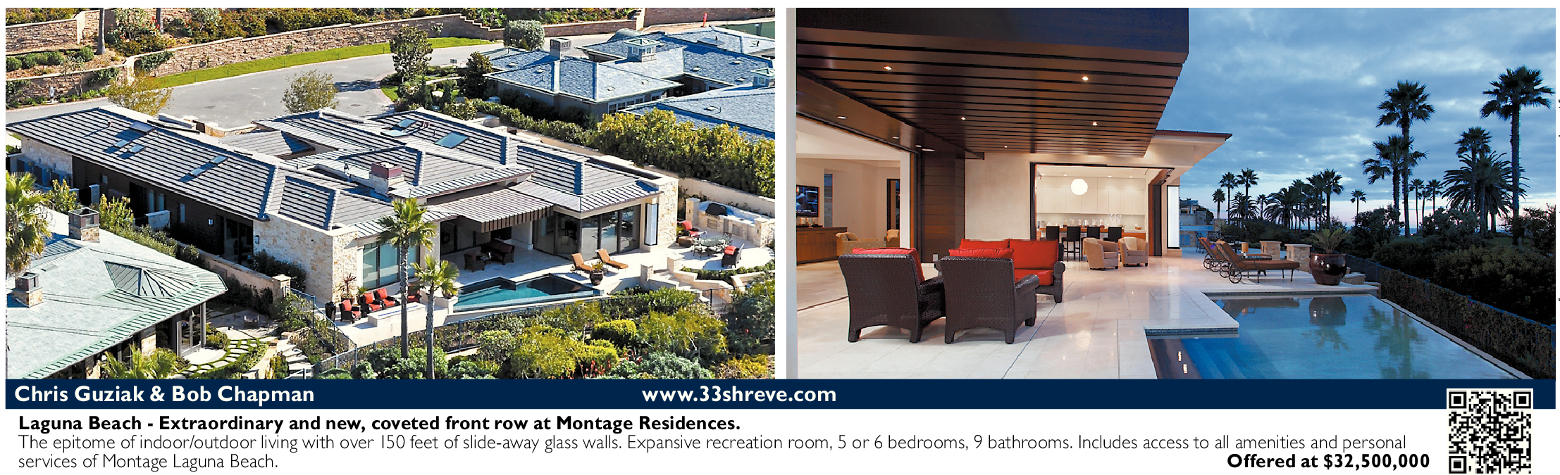 Chris Guziak & Bob Chapman www.33shreve.com Laguna Beach - Extraordinary and new, coveted front row at Montage Residences. The epitome of indoor/outdoor living with over 150 feet of slide-away glass walls. Expansive recreation room, 5 or 6 bedrooms, 9 bathrooms. Includes access to all amenities and personal services of Montage Laguna Beach. Offered at $32,500,000