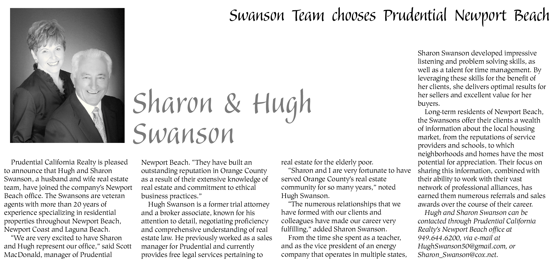 Hugh and Sharon Swanson can be contacted through Prudential California Realty’s Newport Beach office at 949.644.6200, via e-mail at HughSwanson50@gmail.com, or Sharon_Swanson@cox.net.
