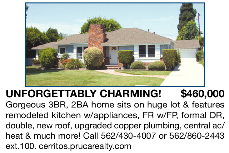 UNFORGETTABLY CHARMING! $460,000 Gorgeous 3BR, 2BA home sits on huge lot & features remodeled kitchen w/appliances, FR w/FP, formal DR, double, new roof, upgraded copper plumbing, central ac/ heat & much more! Call 562/430-4007 or 562/860-2443 ext.100. cerritos.prucarealty.com