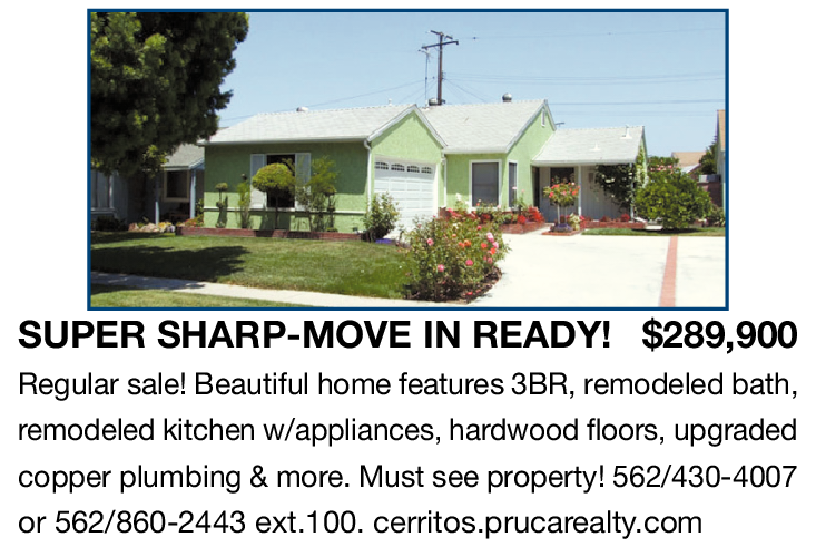 SUPER SHARP-MOVE IN READY! $289,900 Regular sale! Beautiful home features 3BR, remodeled bath, remodeled kitchen w/appliances, hardwood floors, upgraded copper plumbing & more. Must see property! 562/430-4007 or 562/860-2443 ext.100. cerritos.prucarealty.com
