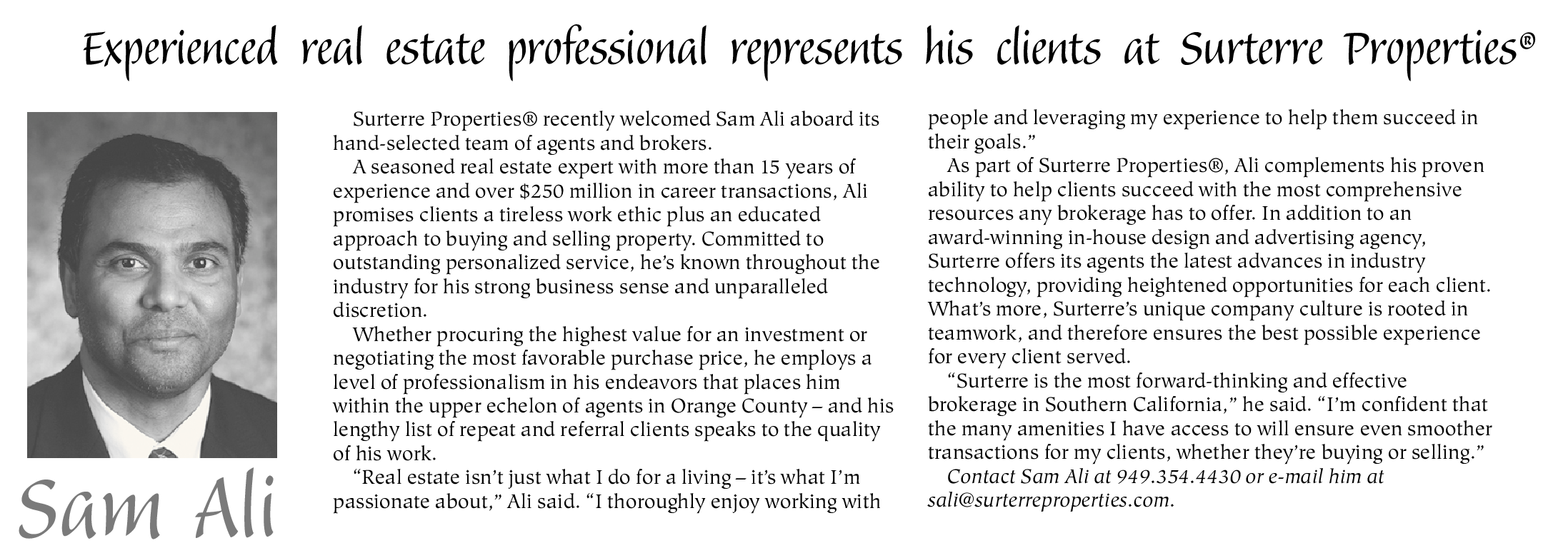 Contact Sam Ali at 949.354.4430 or e-mail him at sali@surterreproperties.com.