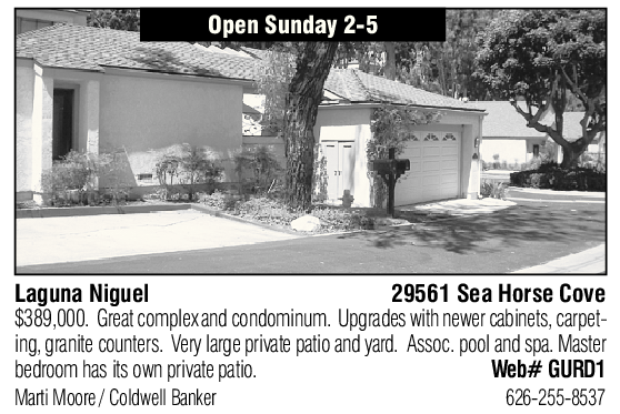 Open Sunday 2-5 Laguna Niguel 29561 Sea Horse Cove $389,000. Great complex and condominum. Upgrades with newer cabinets, carpeting, granite counters. Very large private patio and yard. Assoc. pool and spa. Master bedroom has its own private patio. Web# GURD1 Marti Moore / Coldwell Banker 626-255-8537 See also