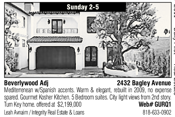 Beverlywood Adj 2432 Bagley Avenue spared. Gourmet Kosher Kitchen. 5 Bedroom suites. City light views from 2nd story. Mediterrenean w/Spanish accents. Warm & elegant, rebuilt in 2009, no expense Turn Key home. offered at $2,199,000 Web# GURQ1 Leah Avnaim / Integrity Real Estate & Loans 818-633-0902 Sunday 2-5