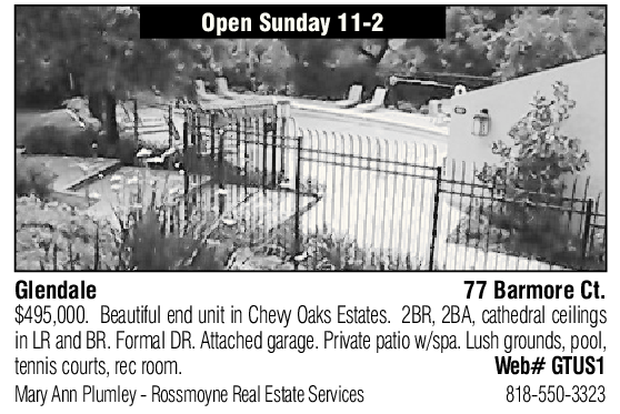 Glendale 77 Barmore Ct. $495,000. Beautiful end unit in Chevy Oaks Estates. 2BR, 2BA, cathedral ceilings in LR and BR. Formal DR. Attached garage. Private patio w/spa. Lush grounds, pool, tennis courts, rec room. Web# GTUS1 Mary Ann Plumley - Rossmoyne Real Estate Services 818-550-3323