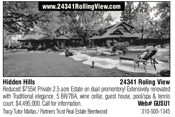 Hidden Hills 24341 Roling View Reduced $755k! Private 2.5 acre Estate on dual promontory! Extensively renovated with Traditional elegance. 5 BR/7BA, wine cellar, guest house, pool/spa & tennis court. $4,495,000. Call for information. Web# GUSU1 Tracy Tutor Maltas / Partners Trust Real Estate Brentwood 310-500-1345