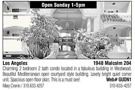 Los Angeles 1948 Malcolm 204 Charming 2 bedroom 2 bath condo located in a fabulous building in Westwood. Beautiful Mediterranean open courtyard style building. Lovely bright quiet corner unit. Spacious open floor plan. This is a must see! Web# GUDN1 Mary Cronin / 310.633.4257 310-633-4257