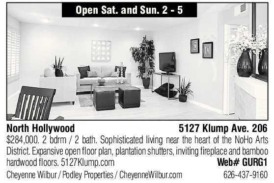 North Hollywood 5127 Klump Ave. 206 $284,000. 2 bdrm / 2 bath. Sophisticated living near the heart of the NoHo Arts District. Expansive open floor plan, plantation shutters, inviting fireplace and bamboo hardwood floors. 5127Klump.com Web# GURG1 Cheyenne Wilbur / Podley Properties / CheyenneWilbur.com 626-437-9160