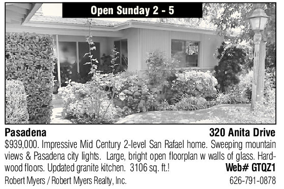 Open Sunday 2 - 5 Pasadena 320 Anita Drive $939,000. Impressive Mid Century 2-level San Rafael home. Sweeping mountain views & Pasadena city lights. Large, bright open floorplan w walls of glass. Hardwood floors. Updated granite kitchen. 3106 sq. ft.! Web# GTQZ1 Robert Myers / Robert Myers Realty, Inc. 626-791-0878 See also